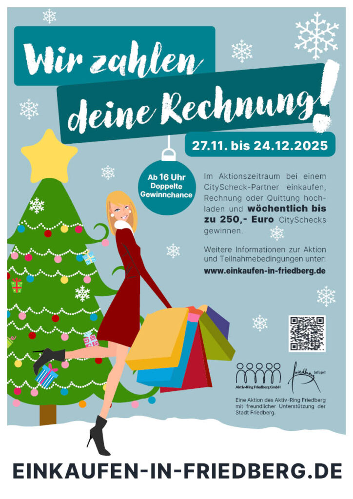 - Dauer des Gewinnspiels. Jede Woche im Advent gibt es die Chance, den Einkaufsbetrag bei einem CityScheck Friedberg – Partner in Form von City-Schecks zu gewinnen. Die erste Auslosung findet am 30.11.2025 statt. Hier werden alle Belege vom 27.11.2025 bis 29.11.2025 berücksichtigt.